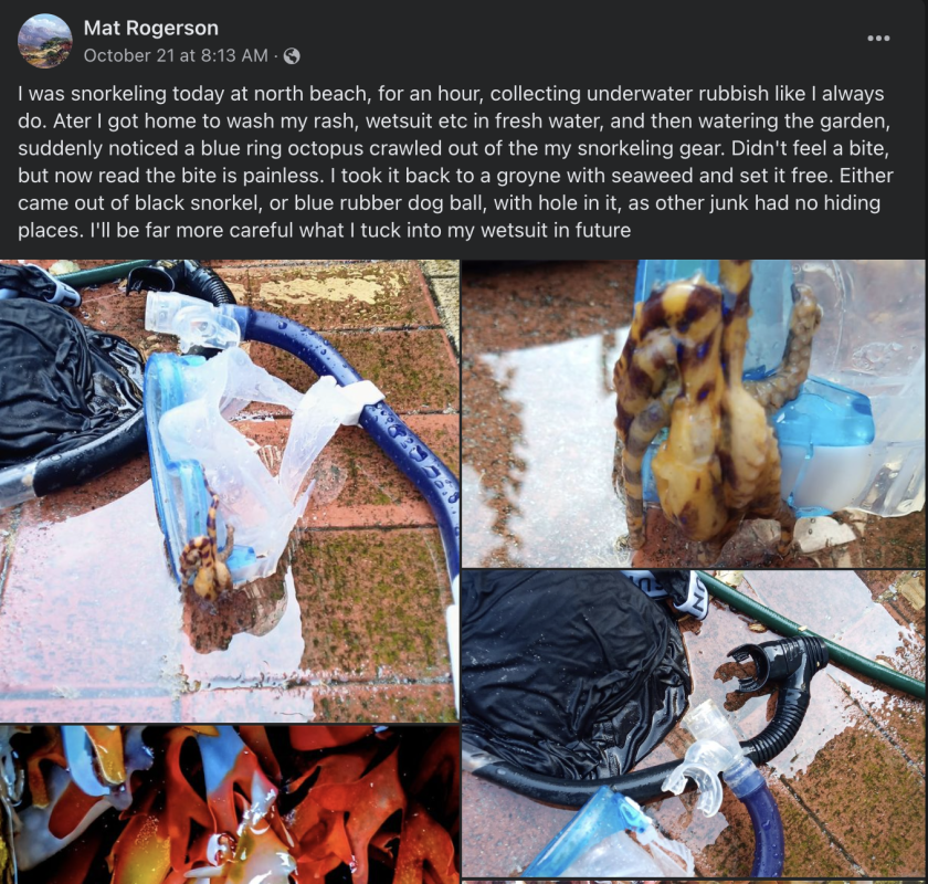 “Suddenly noticed a blue ring octopus crawled out of the my snorkeling gear,” he recounted in a Facebook post. “Didn’t feel a bite, but now read the bite is painless. I took it back to a groyne with seaweed and set it free.”